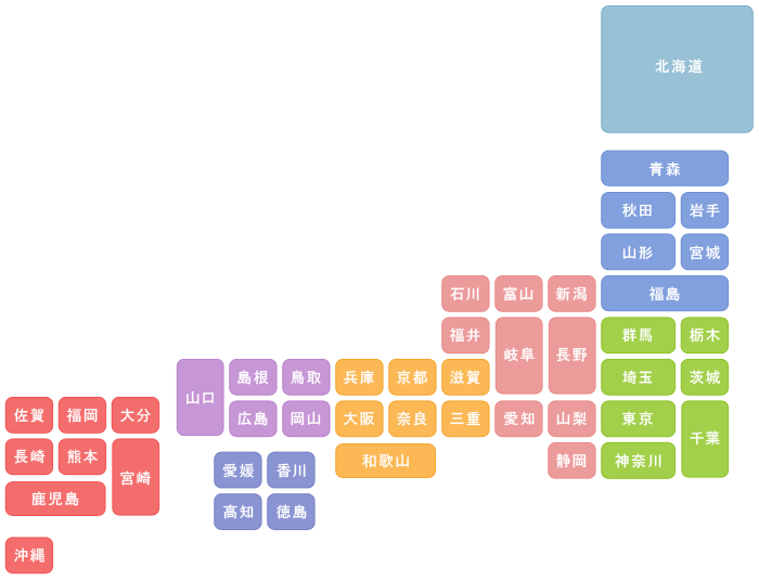 北海道 青森 岩手 秋田 宮城 山形 福島 栃木 茨城 千葉 群馬 埼玉 東京 神奈川 新潟 長野 山梨 静岡 富山 岐阜 愛知 石川 福井 滋賀 三重 京都 奈良 兵庫 大阪 和歌山 鳥取 岡山 島根 広島 山口 香川 徳島 愛媛 高知 大分 宮崎 福岡 熊本 佐賀 長崎 鹿児島 沖縄