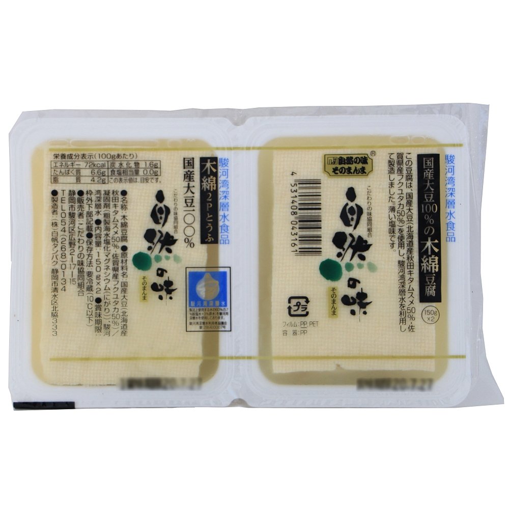 | 原材料 | 国産大豆(北海道産秋田キタムスメ50%・佐賀県産フクユタカ50%)/凝固剤(粗製海水塩化マグネシウム(にがり))/駿河湾深層水/消泡剤 |