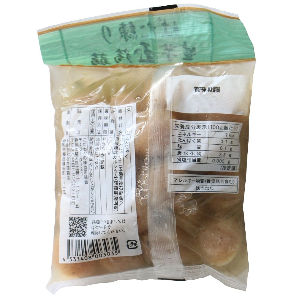 | 原材料 | こんにゃく芋(広島県又は栃木県)/貝殻焼成カルシウム(蒟蒻用凝固剤) |