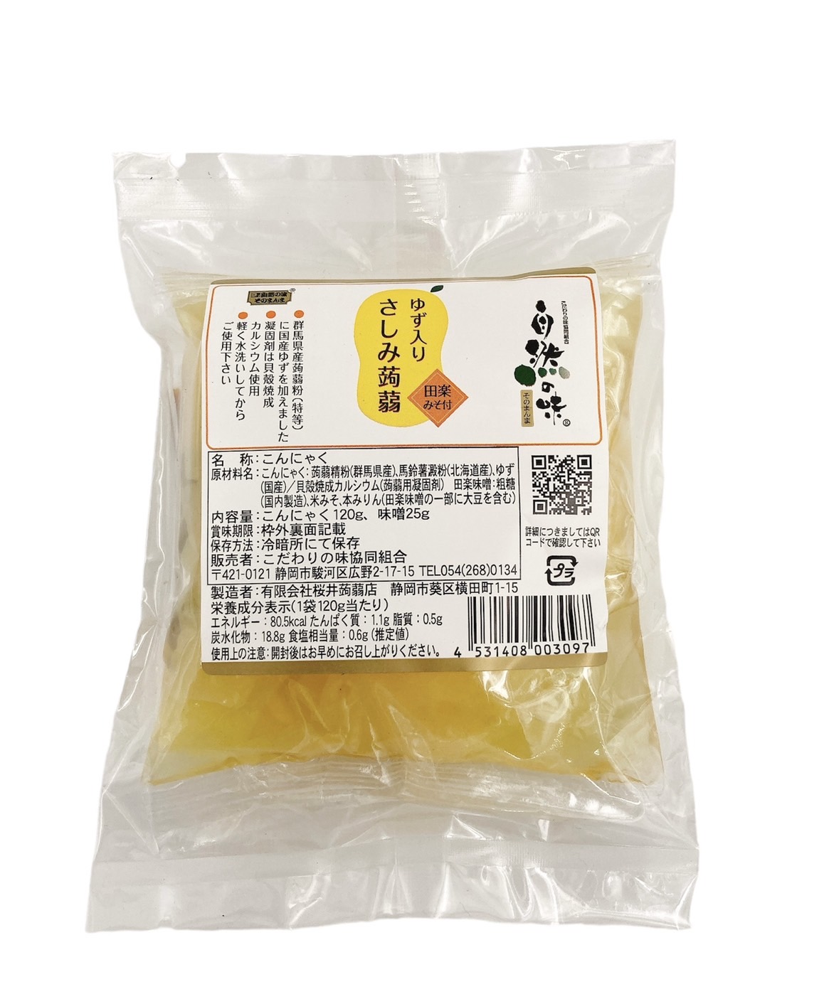 | 原材料 | 蒟蒻:蒟蒻製粉(群馬県産)、馬鈴薯澱粉(北海道産)、ゆず(国産)/貝殻焼成カルシウム(蒟蒻用凝固剤) 田楽味噌:粗糖(国内製造)、米みそ、本みりん |
