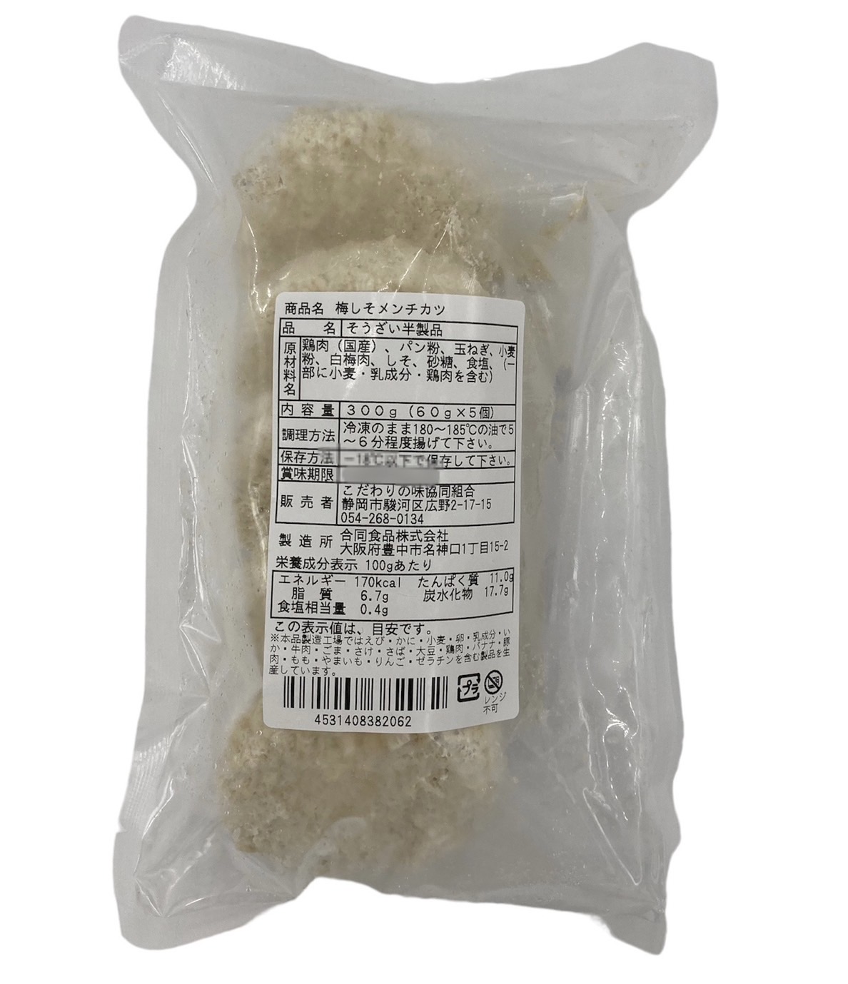 | 原材料 | 鶏肉(国産)、パン粉、玉ねぎ、小麦粉、白梅肉、しそ、砂糖、食塩、(一部に小麦・乳成分・鶏肉を含む) |