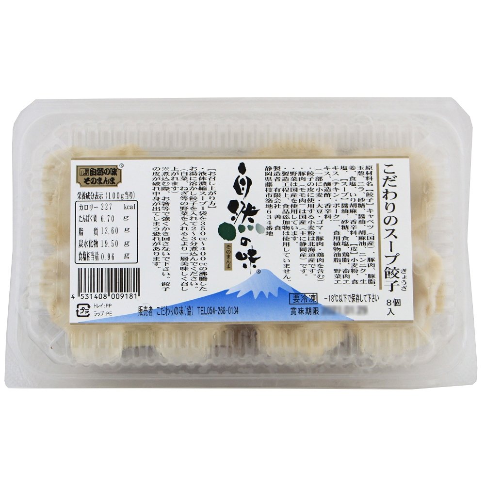 | 原材料 | 【餃子】キャベツ(国産)、豚肉、豚脂、玉葱、ニラ、砂糖、醤油、胡麻油、ニンニク、生姜、食塩、いり胡麻、香辛料【皮】小麦粉、食塩 【スープ】醤油、砂糖、食塩、チキンエキス、ポークエキス、食用植物油脂、野菜エキス、醸造酢、香辛料 (一部に小麦・大豆・ゴマ・豚肉・鶏肉を含む) |