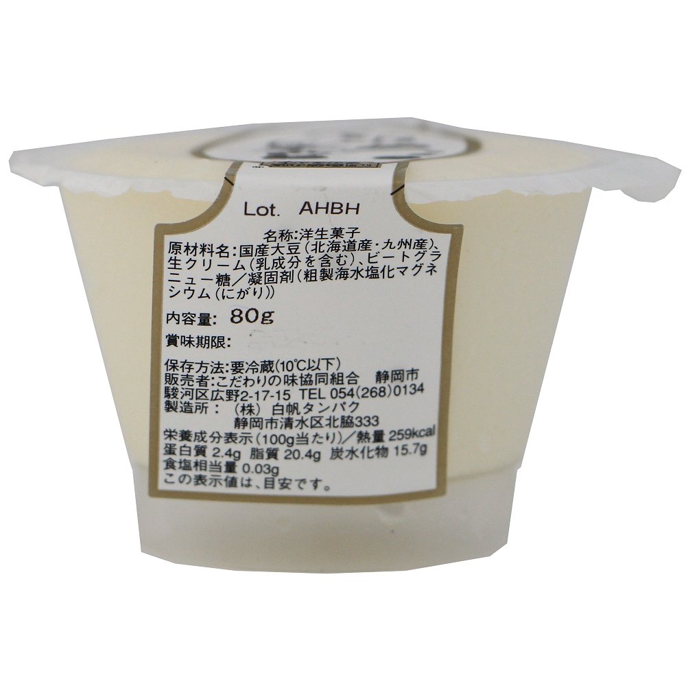 | 原材料 | 国産大豆(北海道産・九州産)、生クリーム、ビートグラニュー糖/凝固剤(粗製海水塩化マグネシウム(にがり)) |