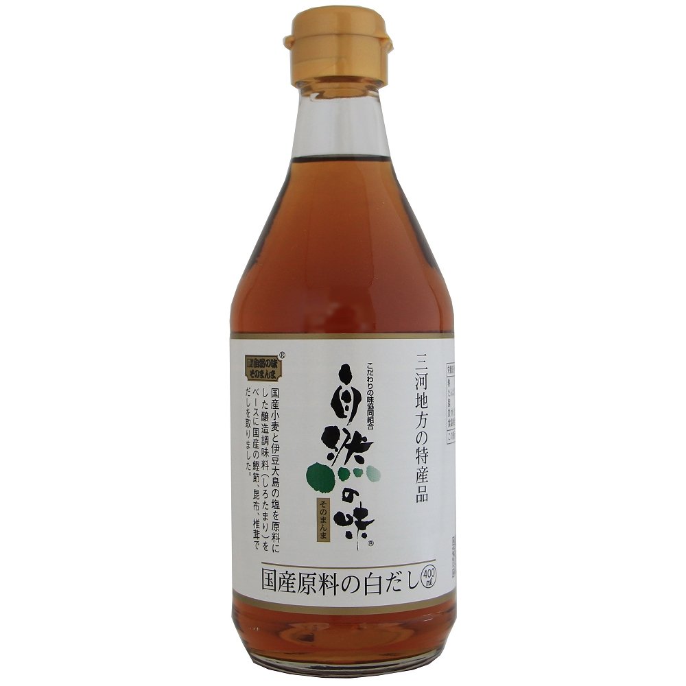 愛知県三河地方の特産品の白たまりがベースの国産原料の白だしです!だしの素材は枕崎産一本かつお、道南産真昆布、愛知県下山村産しいたけです。これらの天然のだし汁に「足助仕込三河しろたまり」を合わせ風味豊かに仕上げた白だしです。「足助仕込三河しろたまり」・・・国産小麦と伊豆大島の自然塩「海の精」を原料に天然醸造の小麦醸造調味料。愛知県東加茂郡足助町の旧小学校校舎(標高約720m)をお借りして、天然水・木桶で仕込。小麦使用量を通常白しょうゆの約2倍とした濃厚な味も魅力です。しろたまりの色がお料理の邪魔をせず、また素材の色をひきたてます。