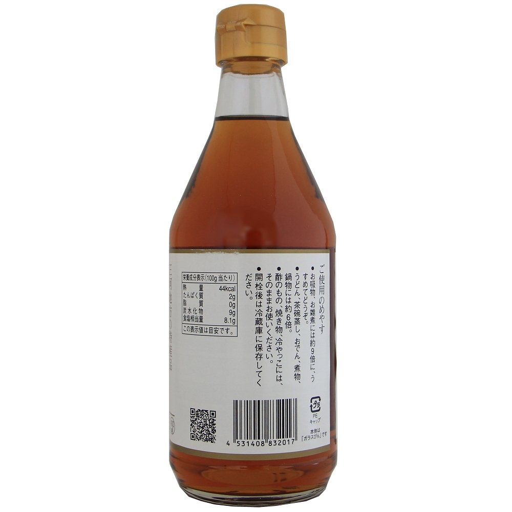| 原材料 | 小麦(国産)、鰹節(枕崎産)、食塩(海の精)、本みりん(三州みりん)、砂糖(粗糖)、焼酎(米)、椎茸(国産)、昆布(真昆布) |