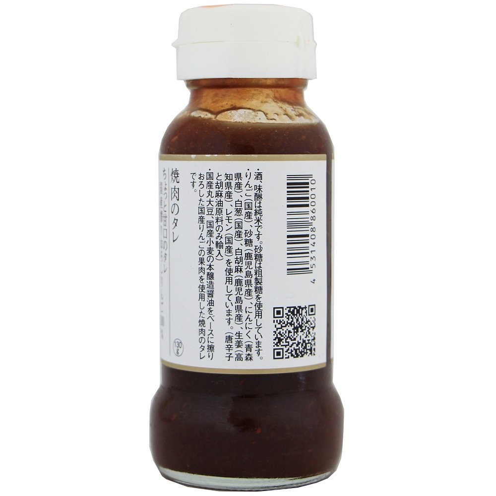| 原材料 | 醤油(国産大豆・国産小麦)、りんご(青森・長野県他)、粗糖(鹿児島県種子島産)、にんにく(青森県)、純米酒、純米本みりん、ごま油、白ねぎ(鳥取県)、白ごま(鹿児島県)、生姜(高知県)、唐辛子(韓国)、レモン(広島県) |