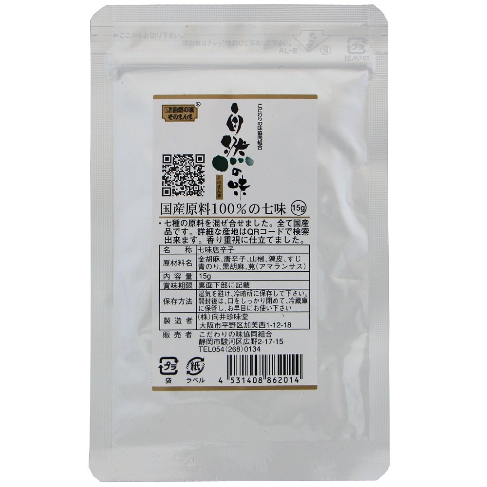 | 原材料 | 金胡麻(国産)、唐辛子(国産)、山椒(和歌山県)、チンピ[うんしゅうみかん](和歌山県・徳島県・大阪府・静岡県・愛媛県)、すじ青のり(高知県)、黒胡麻(国産)、アマランサス(岩手県) |