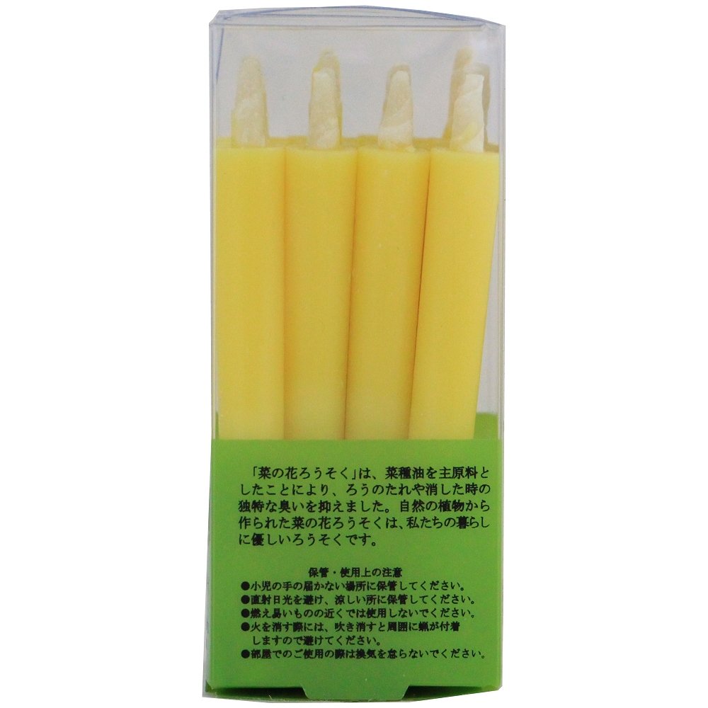 | 原材料 | ※菜の花ろうそくは、燃焼時のロウたれが少なく消した後の独特のにおいも抑えることができました。和ろうそくの特徴は「芯」と「原料」です。 芯は筒状にした和紙の上から灯芯(とうしん)を巻いて作ります。これにより和ろうそく独特の明るく、力強い炎が得られるのです。 和ろうそくの原料には、植物ロウを主原料(菜種油)にしています。 固さを維持し、べたつかないように扱いやすくする為、パラフィンを7%使用しております。 一般に売られている洋ろうそくはパラフィン100%近くの物が多く黒煙が多く発生し、お仏壇や家をいためてしまうおそれがあります。 ろうそくサイズ:1×0.8×8cm(16本入) |