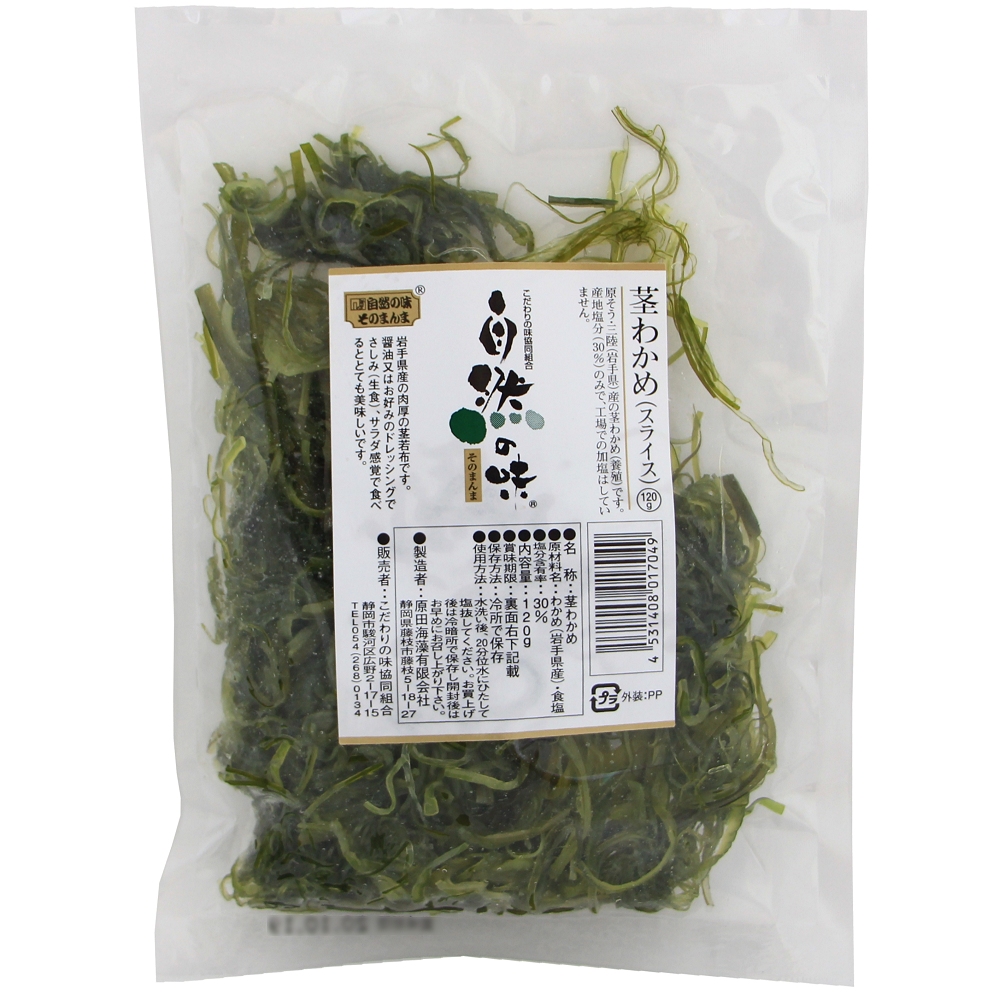 三陸・岩手県産の肉厚の茎若布(わかめ)です!産地塩分30%のみで、工場での加塩はしていません。ヨード他のミネラルが豊富なわかめです。醤油又はお好みのドレッシングでさしみ(生食)、サラダ感覚で食べると、とても美味しいです。