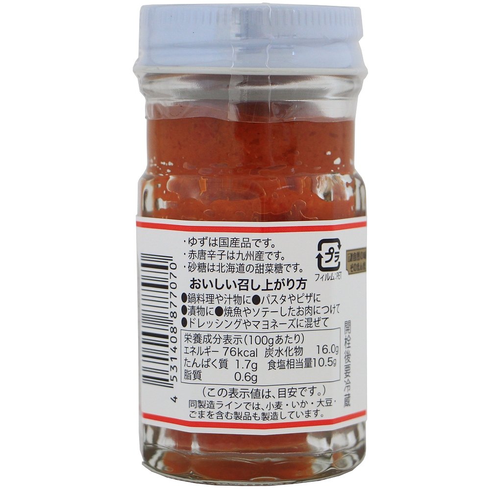 | 原材料 | ゆず(国産)、赤唐辛子塩蔵(九州産)、砂糖(北海道産)(遺伝子組換えでない) |