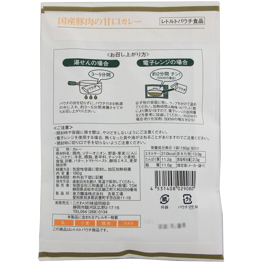 | 原材料 | 豚肉、ソテーオニオン、にんじんペースト、牛乳、食用油脂(豚脂)、香辛料、チャツネ、バナナピューレ、小麦粉、砂糖、食塩、バター、トマトペースト、しょうがペースト、にんにくペースト、酵母エキス、麦芽抽出物 (原料の一部に乳、バナナ、小麦、豚肉を含む) |