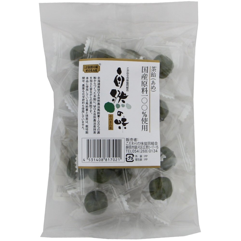 国産原料100%使用の茶飴です!北海道MOA自然農法(※)馬鈴薯100%の澱粉からつくった水飴に、MOA自然農法産抹茶を加えた昔ながらの茶飴です。