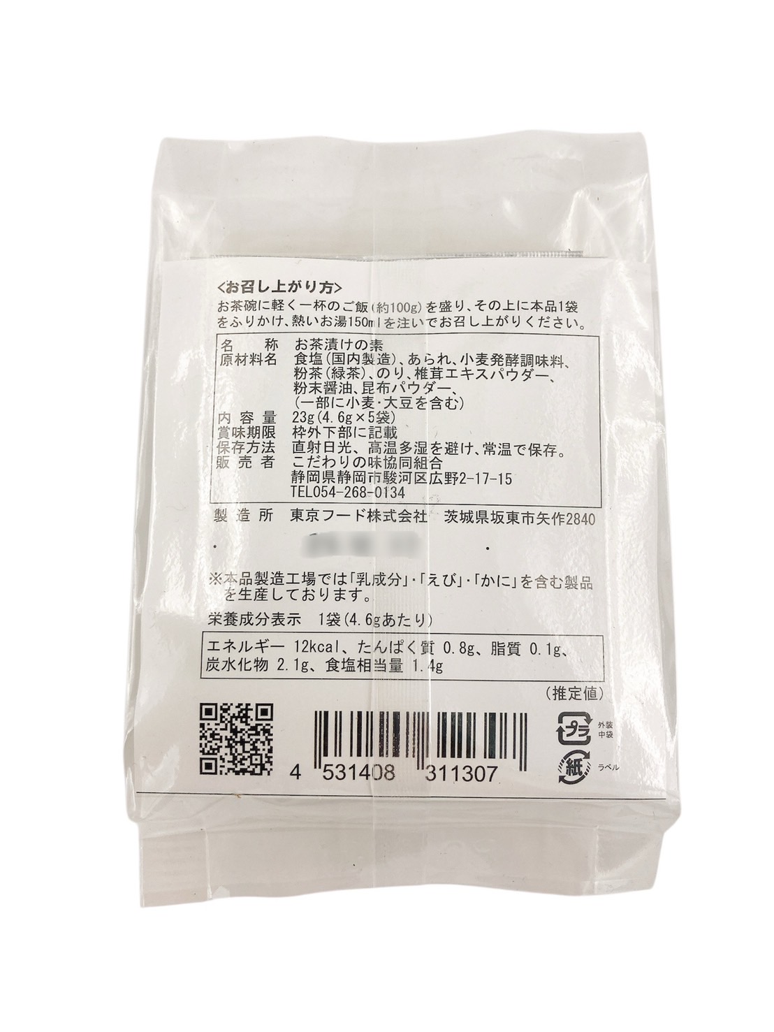| 原材料 | 食塩(天日塩)(国内製造)、あられ(もち米)、小麦発酵調味料(小麦・食塩)、粉茶(緑茶)、のり、椎茸エキスパウダー、粉末醤油、昆布パウダー、(一部に小麦・大豆を含む) |