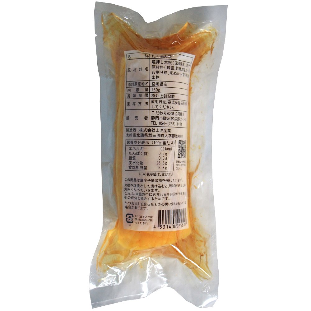| 原材料 | 塩押し大根(宮崎県産)、漬け原材料(はちみつ、砂糖、食塩、かつお削りぶし、米ぬか)/香辛料抽出物 |
