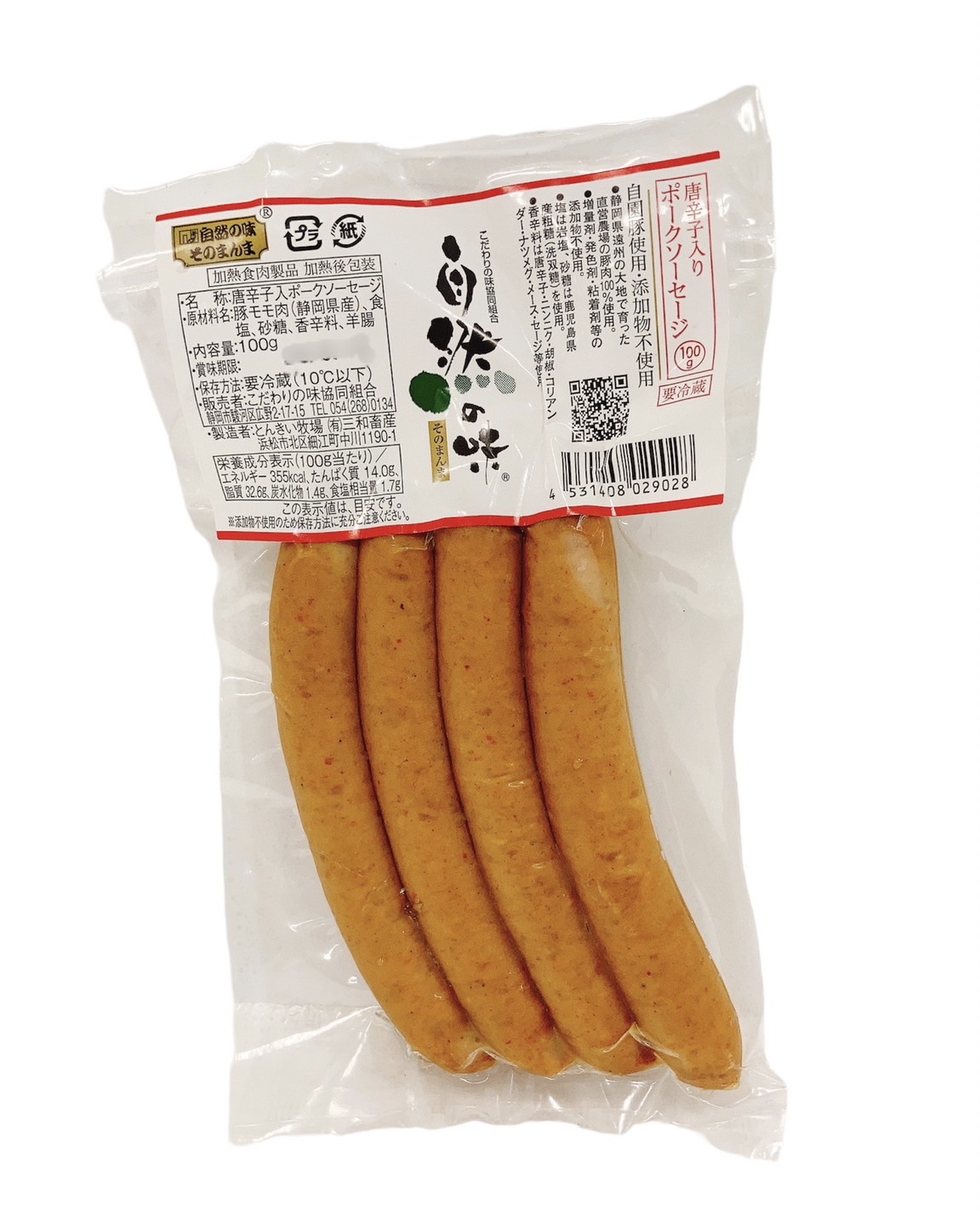 静岡県遠州地方の大地で育った直営農場の豚肉100%使用の唐辛子入ポークソーセージです!原材料は、全国銘柄ポーク高感度コンテストの味覚部門第一位に輝いた豚肉・静岡型銘柄「浜名湖そだち」を100%使用。この新鮮な豚肉を無添加(増量剤・発色剤・接着剤など不使用)でじっくり仕上げました。ボイル・加熱食品ですので、生肉の感覚でそのまま食べられるポークソーセージです。