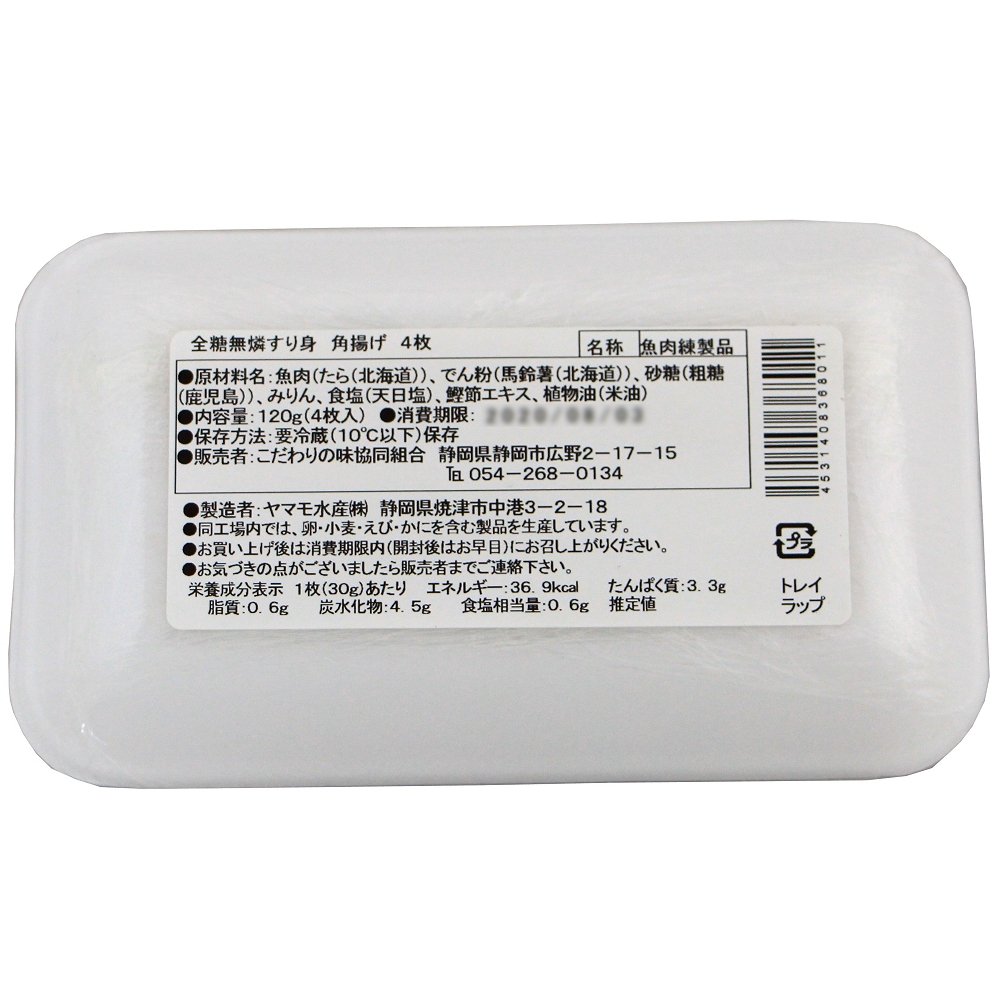 | 原材料 | 魚肉(たら(北海道))、でん粉(馬鈴薯(北海道))、砂糖(粗糖(鹿児島))、みりん、食塩(天日塩)、鰹節エキス、植物油(米油) |