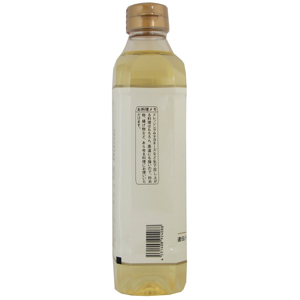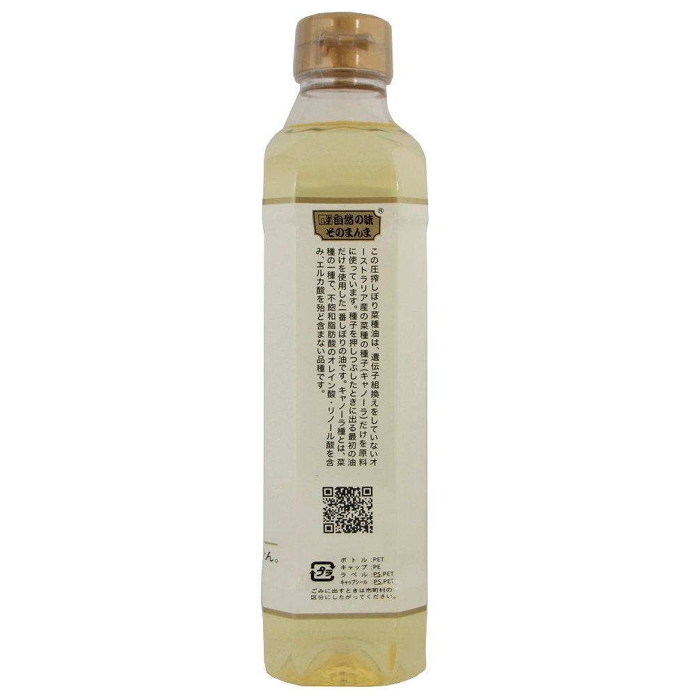 遺伝子組換でない、オーストラリア産のキャノーラ(菜種)の種子から、圧搾法で搾った一番搾りの油です。
