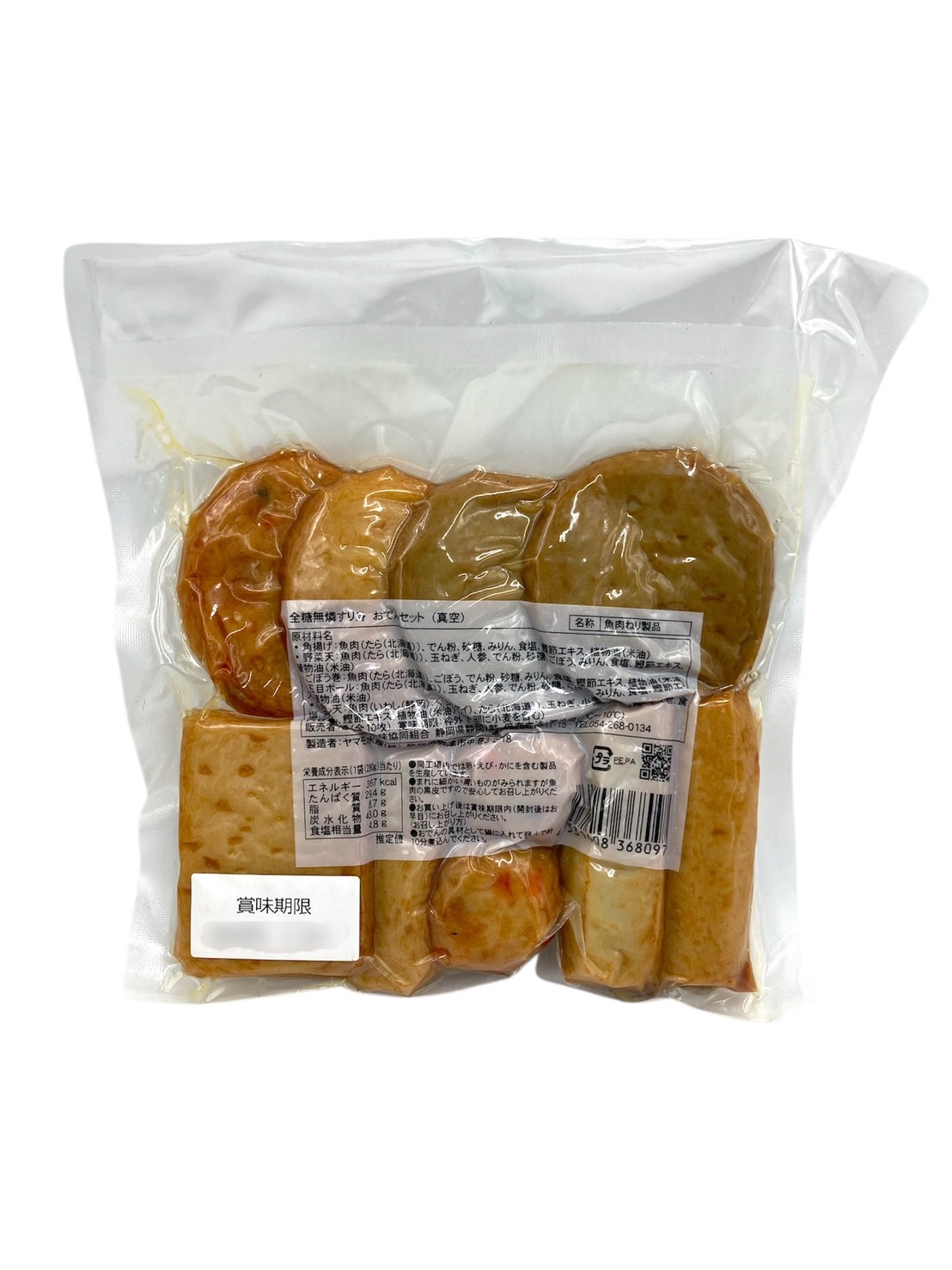 角揚げ・野菜天・ごぼう巻き・五目ボール・いわし天入りです。重合燐酸塩やソルビットを使用しない、全糖の鱈のすり身(北海道産)が主原料です。鹿児島県産粗糖を使用。揚げ油には「米油」を使用し、さっぱりとした味わいに仕上げました。