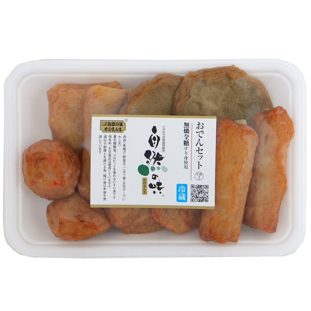 | 原材料 | ●角揚:魚肉(たら)、でん粉、砂糖、みりん、天日塩、鰹節エキス、植物油(米油)●野菜天:魚肉(たら)、玉ねぎ、人参、馬鈴薯澱粉、粗糖、ごぼう、みりん、天日塩、鰹節エキス、植物油(米油)●ごぼう巻:魚肉(たら)、ごぼう、馬鈴薯澱粉、粗糖、みりん、天日塩、鰹節エキス、植物油(米油)●五目ボール:魚肉(たら)、玉ねぎ、人参、馬鈴薯澱粉、粗糖、ごぼう、みりん、食塩、鰹節エキス、植物油(米油)●いわし天:魚肉(いわし、ぐち、たら)、玉ねぎ、小麦蛋白、粗糖、馬鈴薯澱粉、天日塩、みりん、鰹節エキス、植物油(米油) |