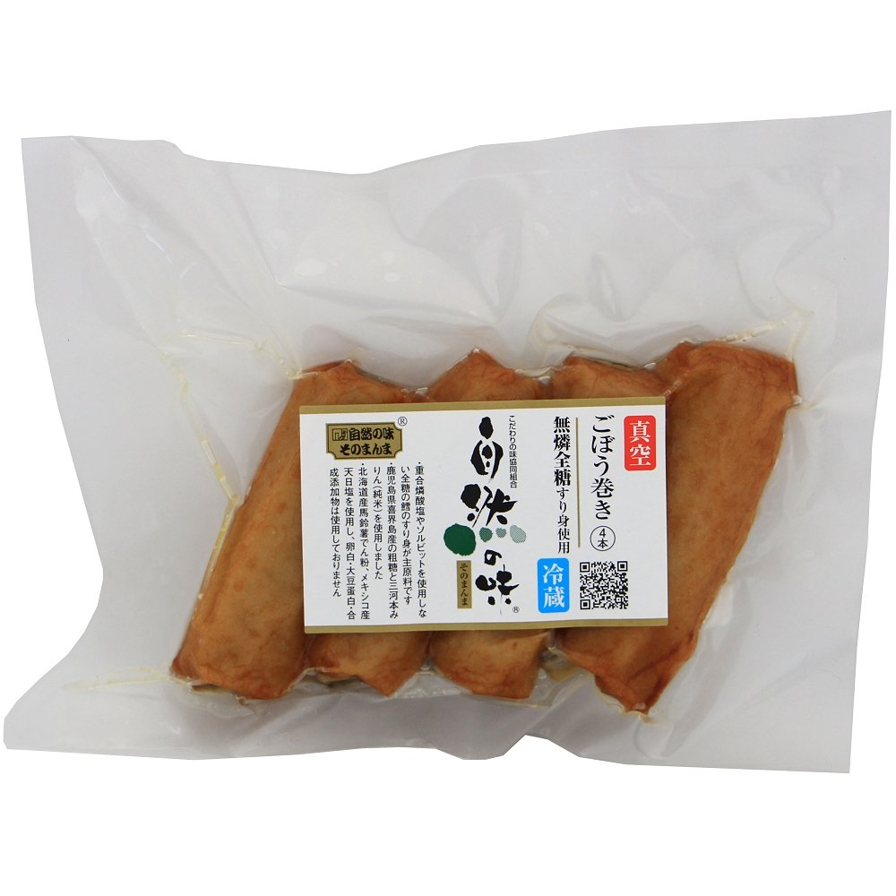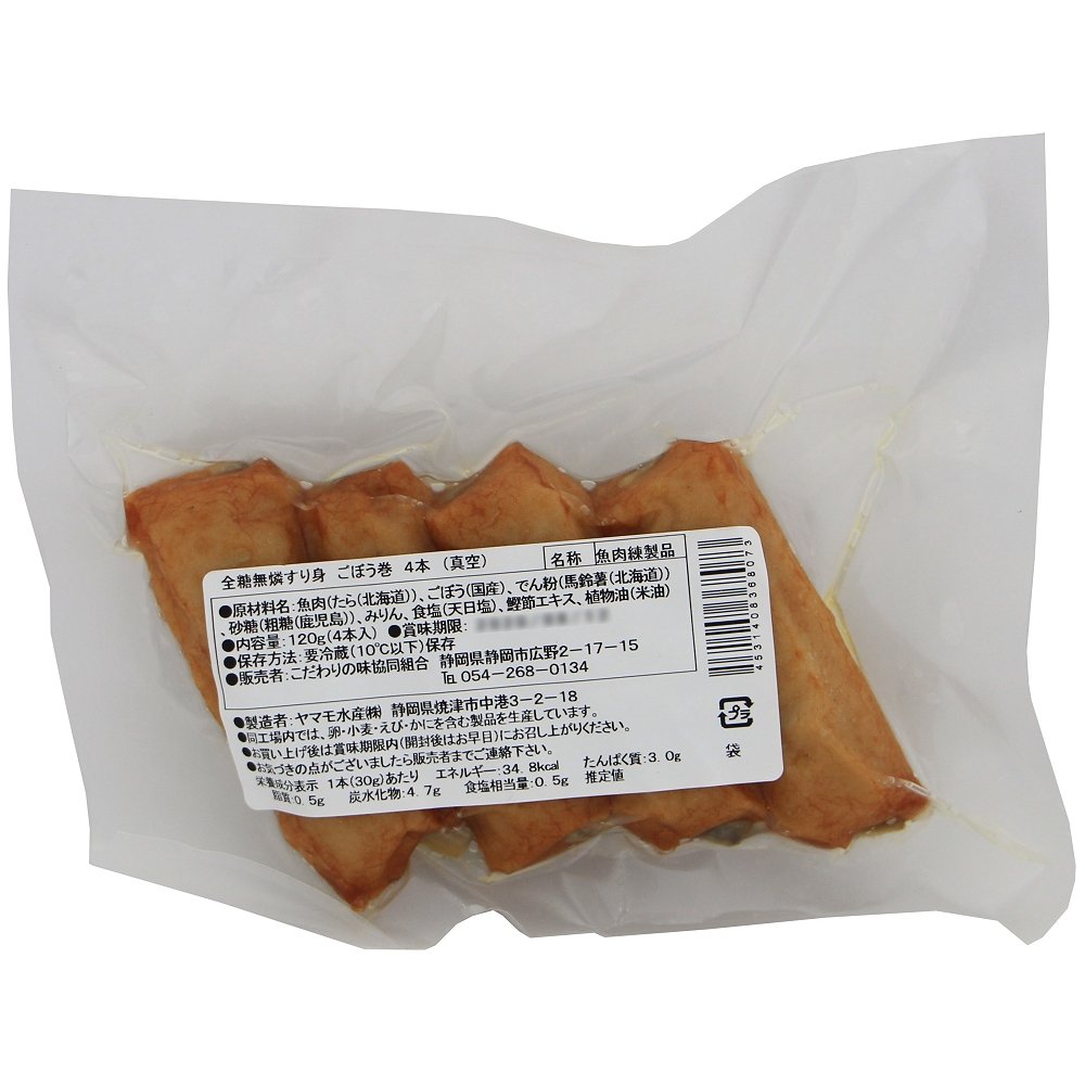 | 原材料 | 魚肉(たら)、ごぼう、でん粉(馬鈴薯(北海道))、砂糖(粗糖(鹿児島))、みりん、天日塩、鰹節エキス、植物油(米油) |