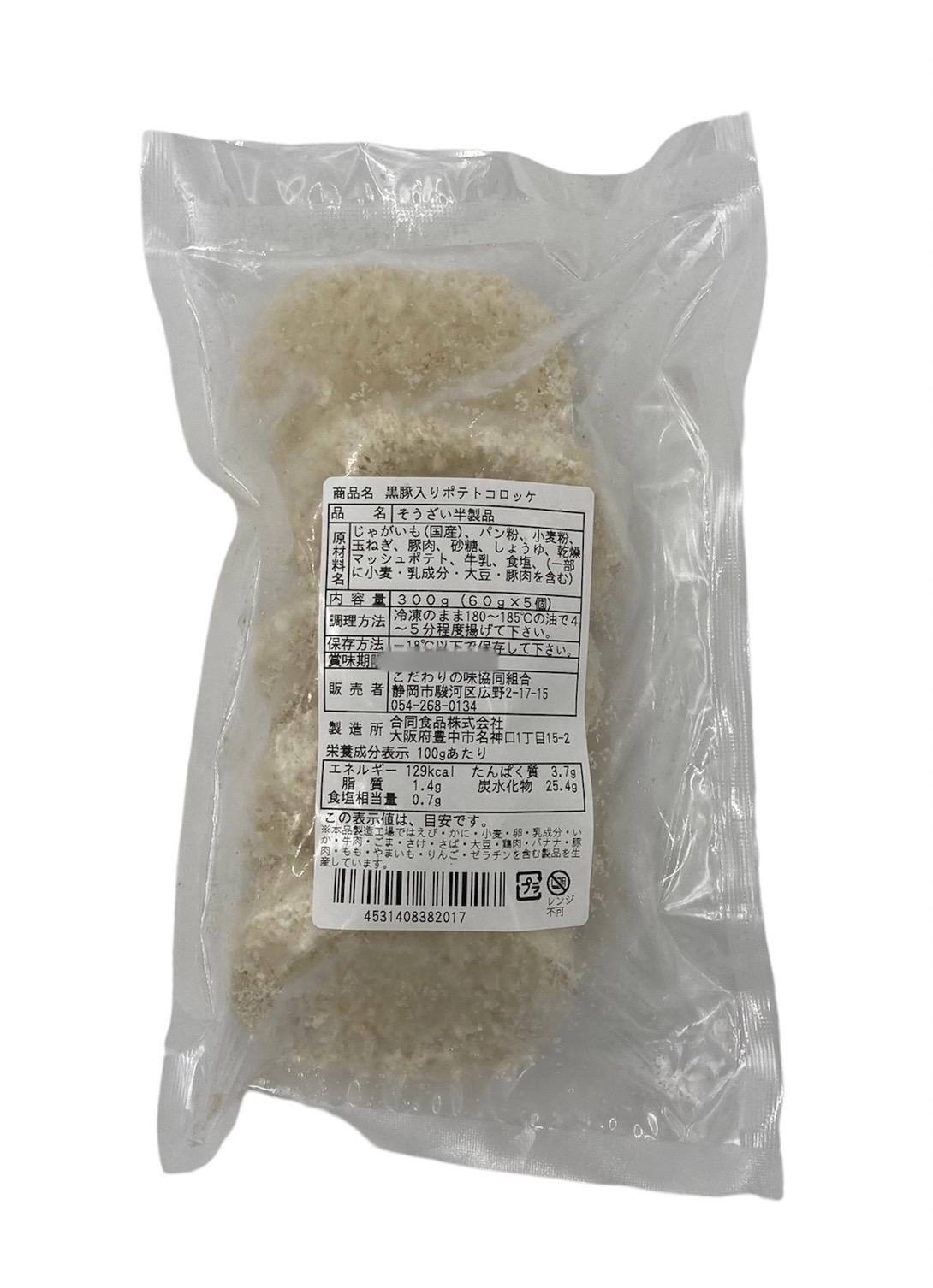 原材料じゃがいも(国産)、パン粉、小麦粉、玉ねぎ、豚肉、砂糖、しょうゆ、乾燥マッシュポテト、牛乳、食塩、(一部に小麦・乳成分・大豆・豚肉を含む)