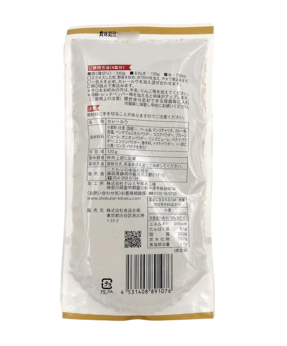 | 原材料 | 小麦粉(小麦(国産))、パーム油、マンゴチャツネ、カレー粉、食塩、ベジタブルエキスパウダー、ココアパウダー、プルーンピューレ、オニオンパウダー、リンゴピューレ、バナナパウダー、ニンジンパウダー、香辛料、トマトパウダー、(一部に小麦・リンゴ・バナナを含む) |