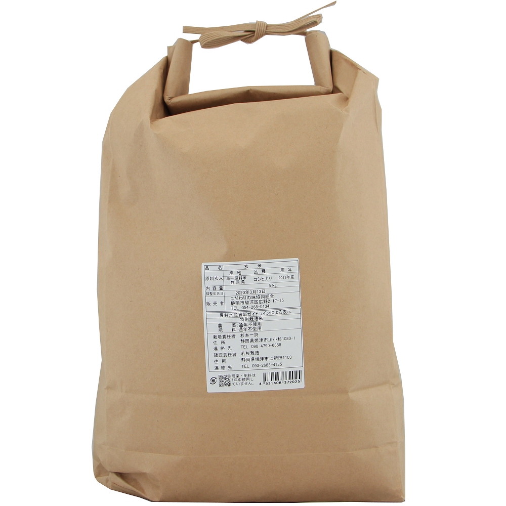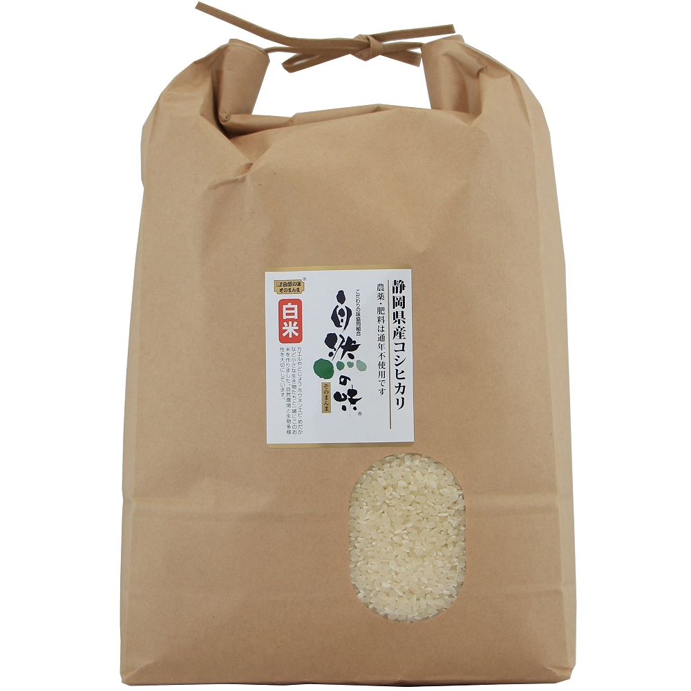 静岡県産こしひかりです。カエルやどじょうなど小さな生き物と共存しながらこのお米を育てました。環境や生き物、私たちに優しい農法で作っています。農薬・化学肥料は通年不使用です。