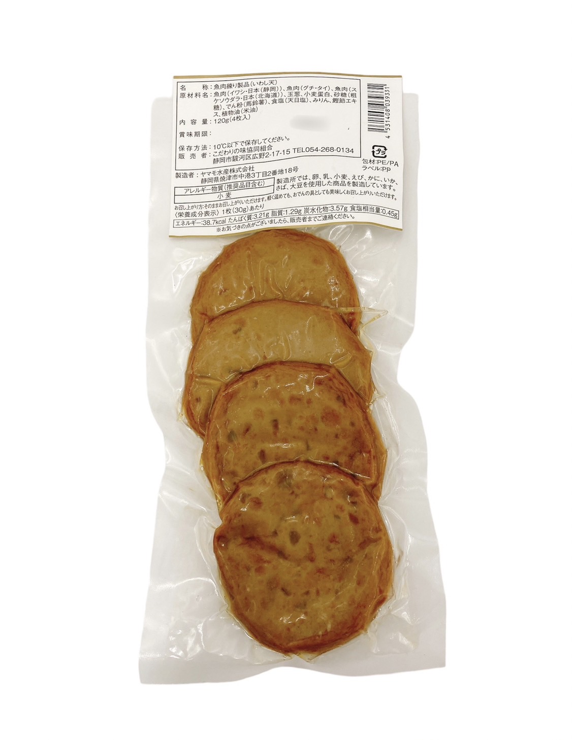 | 原材料 | 魚肉(イワシ・日本(静岡))、魚肉(グチ・タイ)、魚肉(スケトウダラ・日本(北海道))、玉葱、小麦蛋白、砂糖(粗糖)、でん粉(馬鈴薯)、食塩(天日塩)、みりん、鰹節エキス、植物油(米油) |
