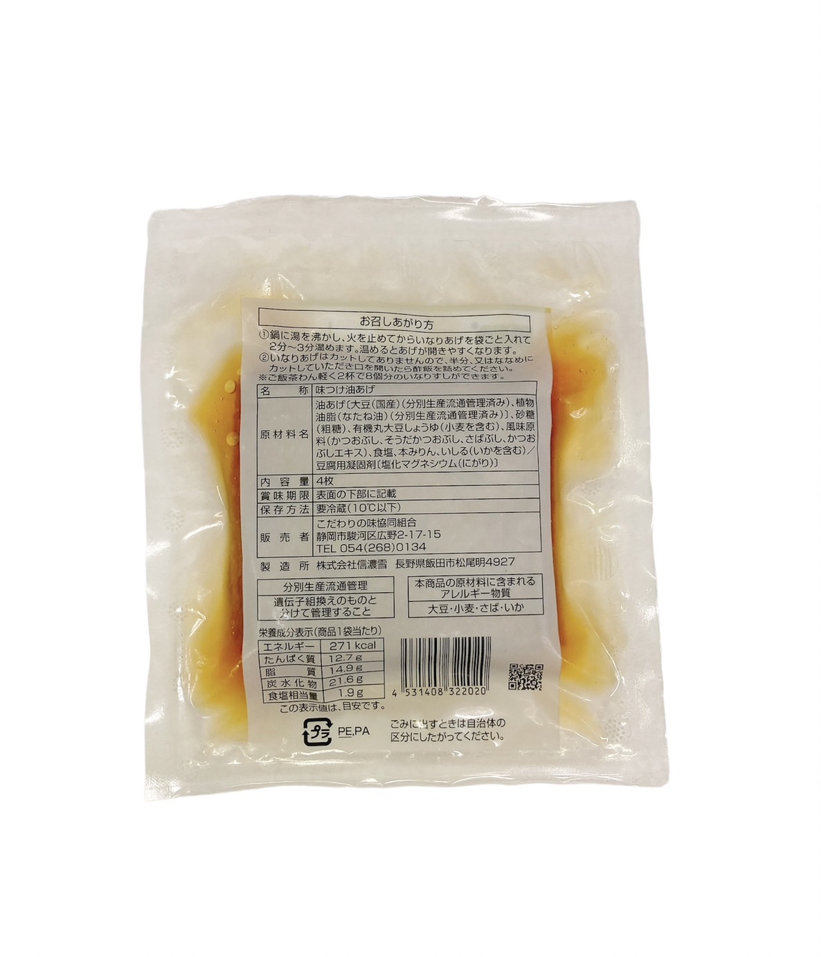 | 原材料 | 油あげ[大豆(国産)(分別生産流通管理済み)、植物油脂(なたね油)(分別生産流通管理済み)]、砂糖(粗糖)、有機丸大豆しょうゆ(小麦を含む)、風味原料(かつおぶし、そうだかつおぶし、さばぶし、かつおぶしエキス)、食塩、本みりん、いしる(いかを含む)/豆腐用凝固剤[塩化マグネシウム(にがり)] |