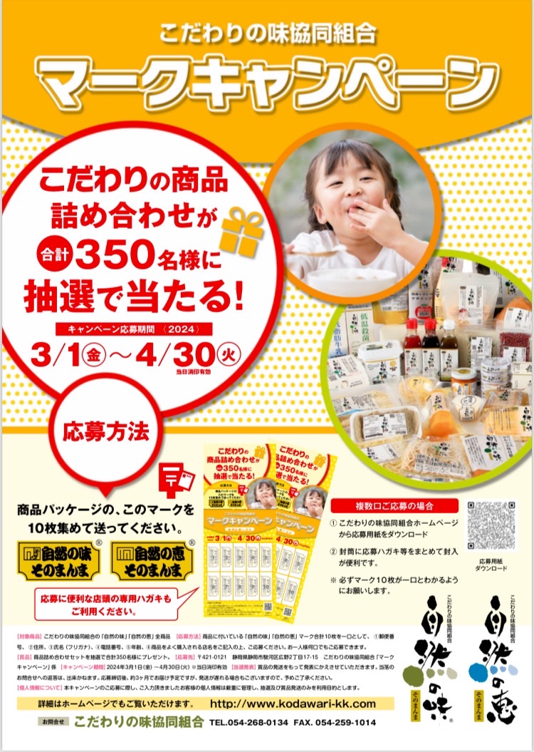 期間中、自然の味・自然の恵商品取扱の全国の販売店にて専用の応募はがきを配布しています。