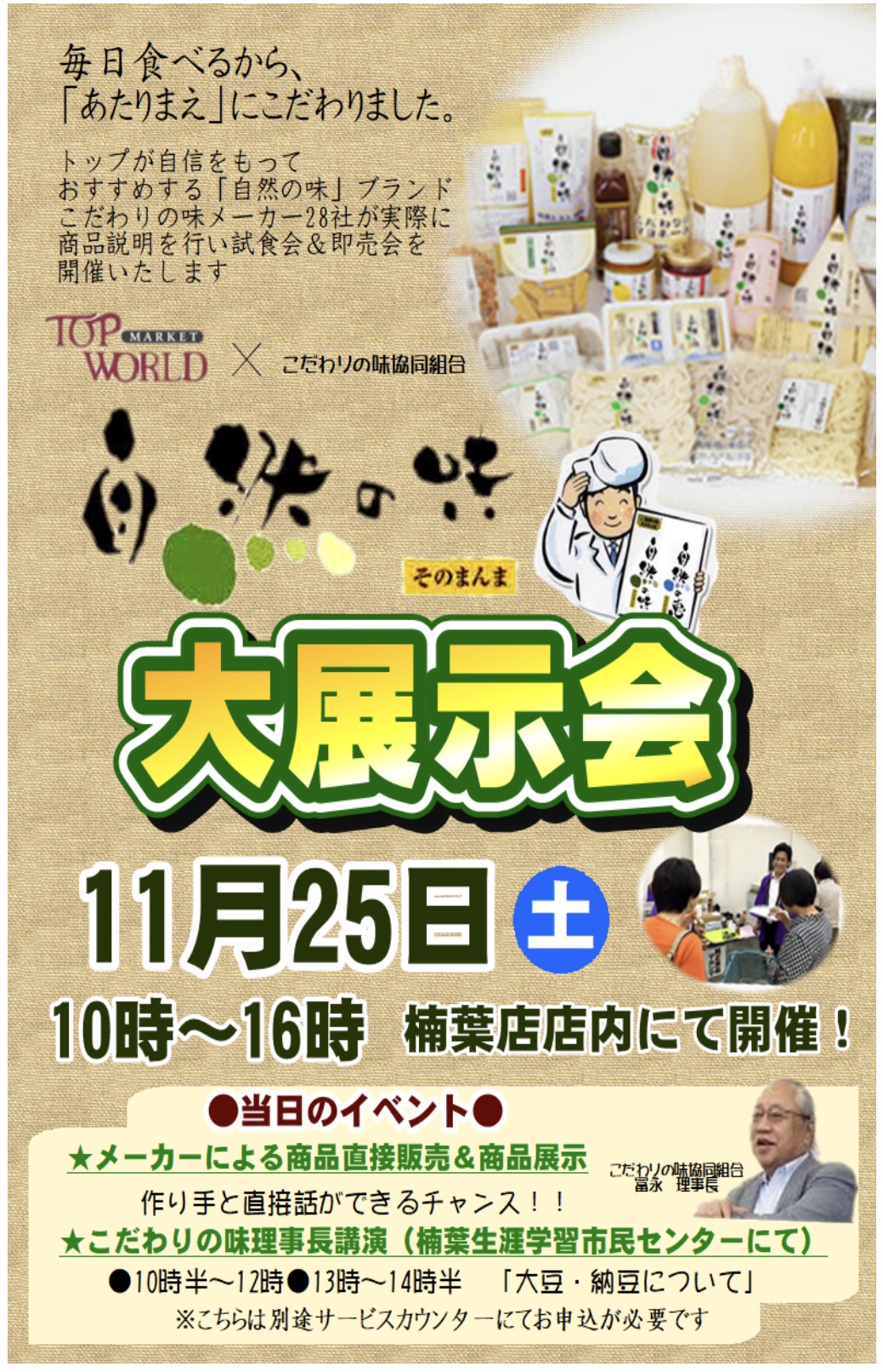 自然の味認定メーカーが27社がトップワールド楠葉店様にて試食説明会をいたします。